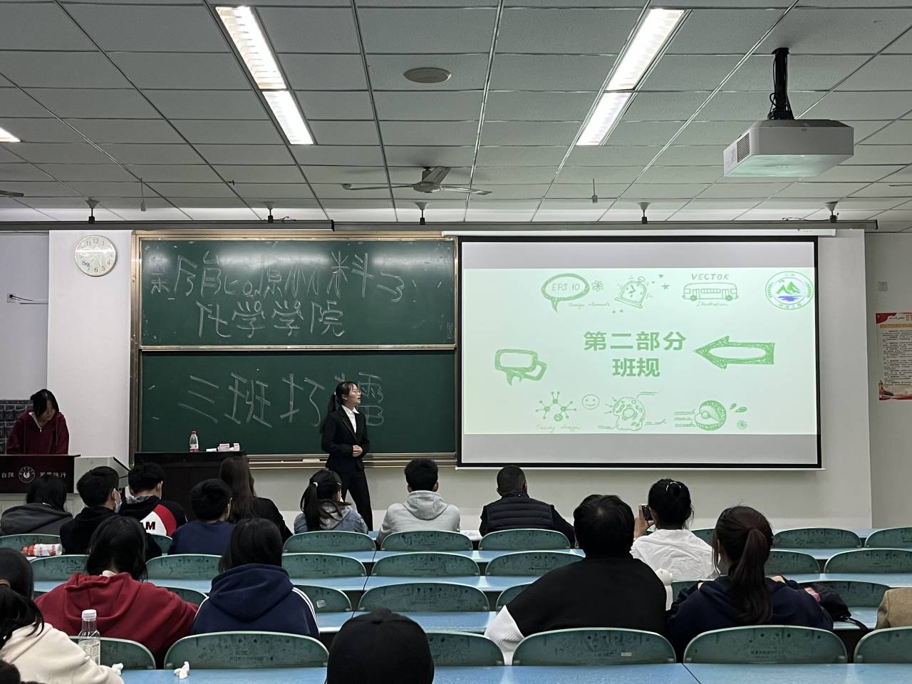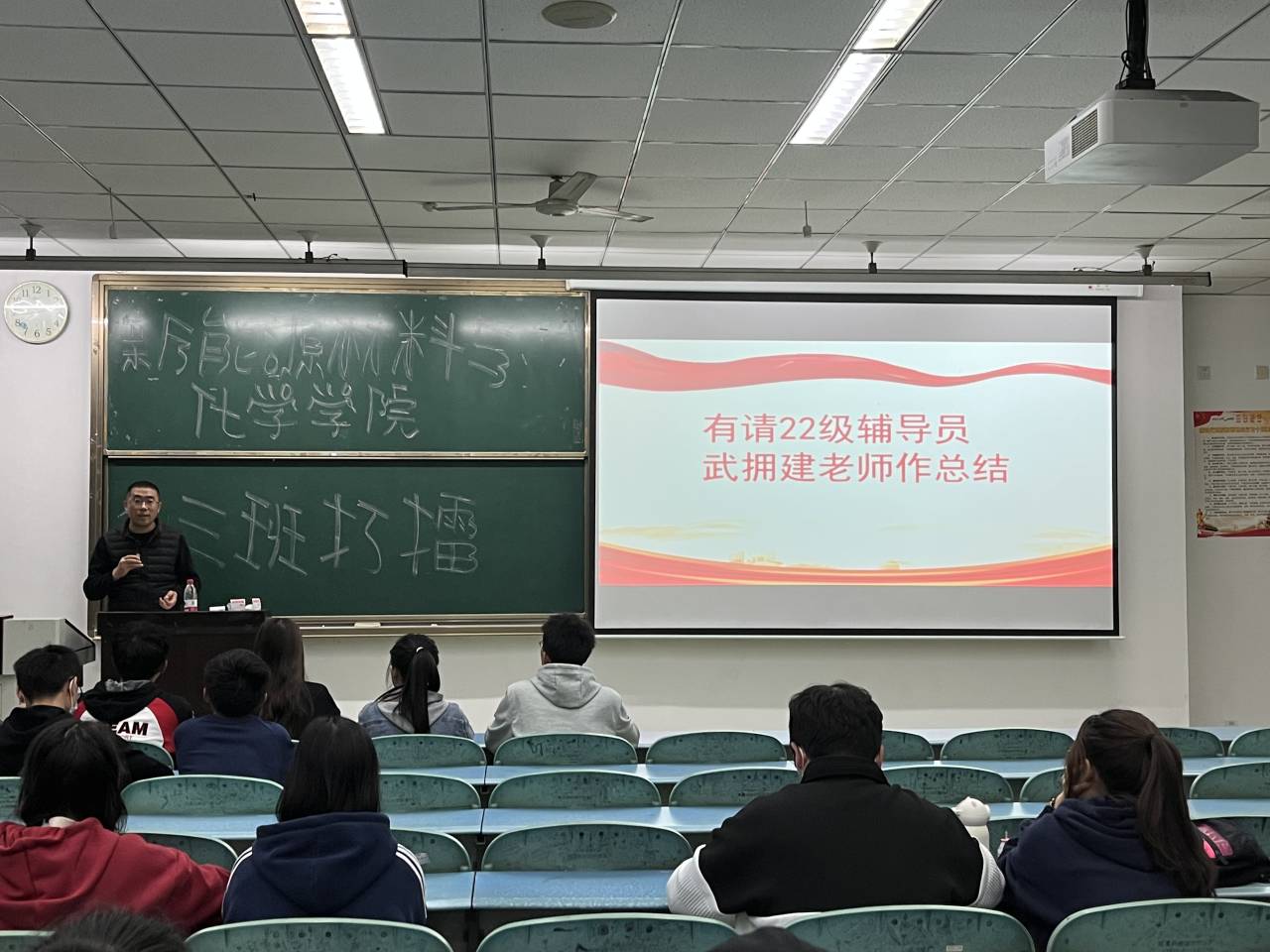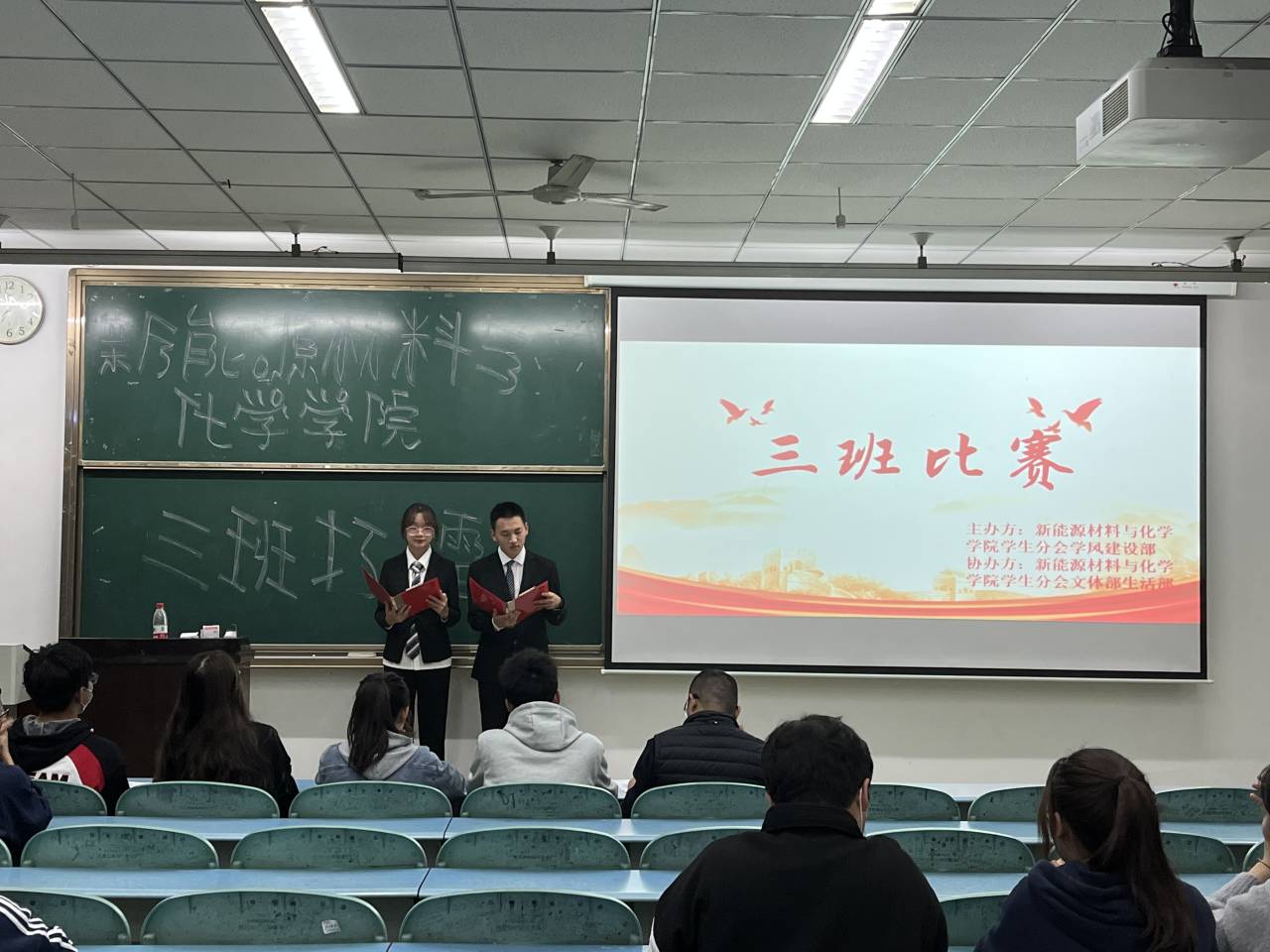 为展现我院新生班级风采,丰富同学们的校园文化生活,增强班级成员的集体荣誉感和凝聚力,激发团体的创新能力,新能源材料与化学学院于11月8日晚上七点在行知楼125教室举行了22级三班打擂活动。本次活动由雷思远、黄婉婷主持,22级辅导员武拥建老师和部分学生干部担任评委。