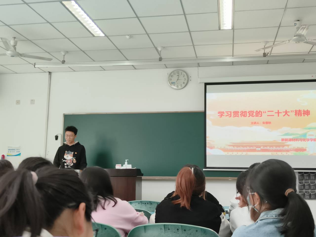 为深入学习贯彻党的二十大精神,让青年学子牢记习近平总书记的嘱托。以新时代青年应有的姿态,奋进新征程,11月10日下午3时,新能源材料与化学学院组织学生干部在行知楼303教室开展“学习贯彻党的二十大精神”主题团日活动。