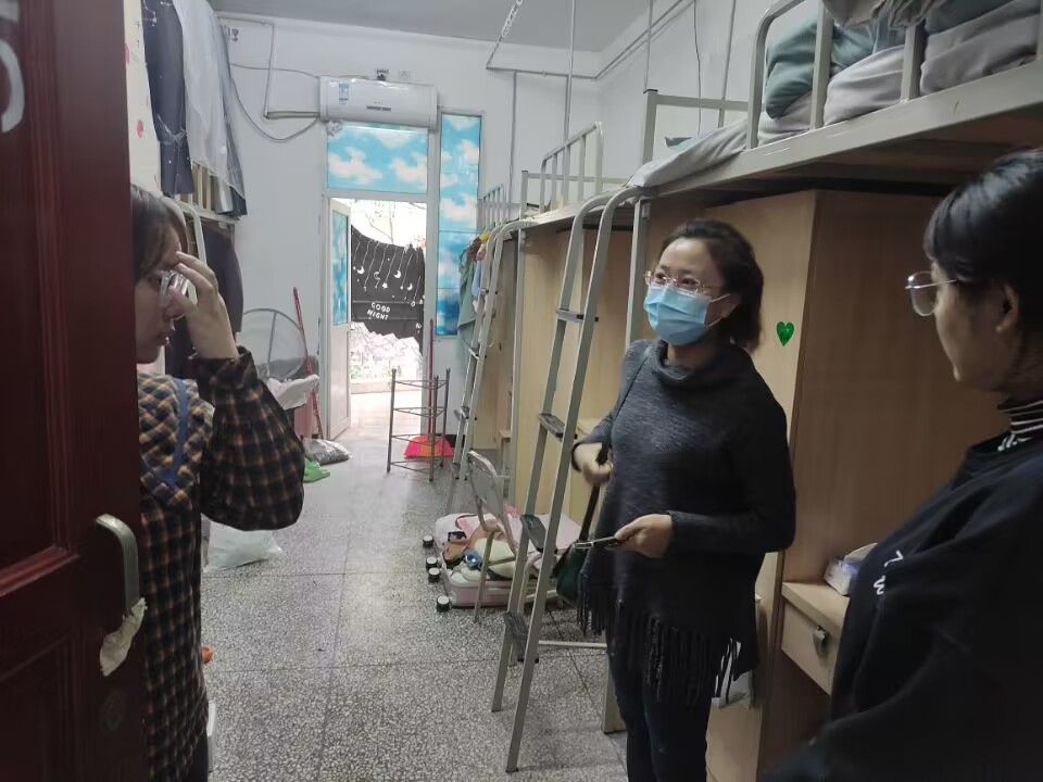 老师们首先关心慰问了新生入住宿舍后的基本情况,温馨关怀新生们的生活起居。亲切地关心同学们是否习惯新校园、校园一卡通、寝室用品等情况,同时也提醒同学们要注意自己的身体健康,注重规律饮食、规律作息。也对寝室良好的卫生条件做出了期许。
