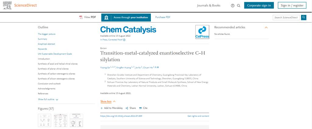 本网讯(文、图/葛怡聪)8月15日,我校新能源材料与化学学院(以下简称“学院”)青年教师、四川省天然产物化学与小分子催化重点实验室成员葛怡聪博士以第一作者(乐山师范学院为第二单位)与南方科技大学(第一单位)在材料化学领域王牌期刊Chem 子刊Chem Catalysis在线合作发表了综述性研究论文Transition-metal-catalyzed enantioselective C-H silylation(Chem影响因子为25.832,Chem Catalysis的非官方预测影响因子为22.804),这是学院自成立以来发表的影响因子可能最高的论文,也是首次以有机硅化学为主题发表的SCI综述性论文,表明我校在该领域的研究成果获得了国际同行认可。