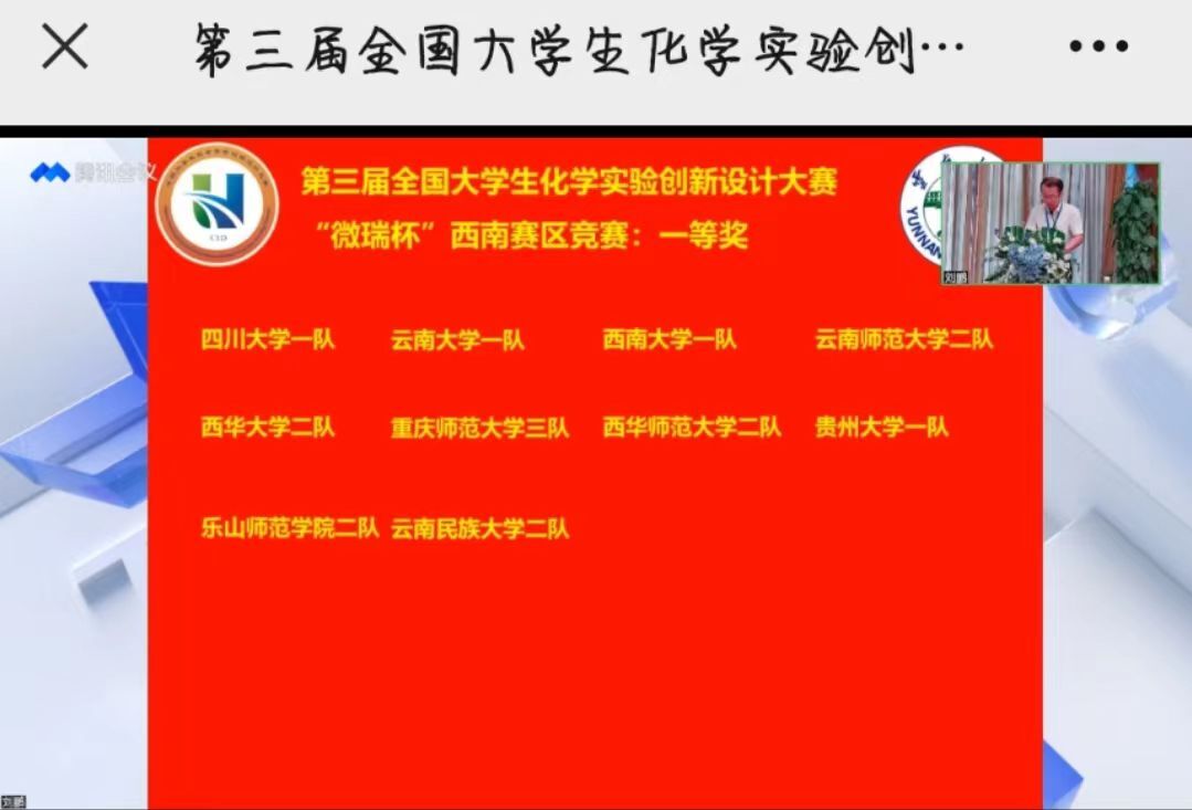 本网讯(文/温志国 图/史凯)2022年7月17日-19日,由教育部高等学校化学类专业教学指导委员会主办,高等学校国家级实验教学示范中心联席会协办,云南大学承办的第三届全国大学生化学实验创新设计大赛“微瑞杯”西南赛区竞赛在云南大学举行。新能源材料与化学学院选拔的三支参赛队代表我校参加了本赛事,经过初赛均成功进入复赛,并在复赛中均获奖,其中2019级材料科学与工程专业赵海秀代表队的“一步溶剂热高效合成不同色彩的CeO2及其机理探索”作品(指导老师:徐要辉)以第九名的成绩获得一等奖并代表西南赛区参加全国总决赛,2020级化学专业张颖代表队的“‘裸眼’可视化检测新冠病毒的新方法研究”作品(指导老师:史凯、宋九华)获得二等奖,2019级化学专业徐玉玲代表队(指导老师:曾鸿耀)的“无金属催化的多步串联‘一锅法’水相绿色合成[1,2,3]-三唑并[5,1-c] [1,4]-苯并噁嗪”作品获得三等奖。这是我校参加该赛事以来首次获得一等奖,也是代表西南赛区参加全国总决赛10项作品中的唯一一所地方本科院校。
