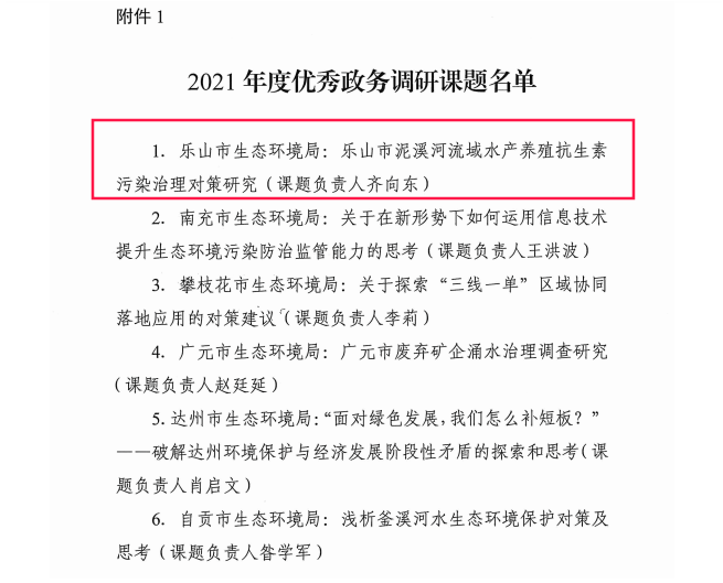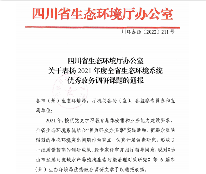本网讯(文、图/常佳丽)近日,四川省生态环境厅发布了《关于表扬2021年度全省生态环境系统优秀政务调研课题的通报》(川环办函【2022】211号),其中《乐山市泥溪河流域水产养殖抗生素污染治理对策研究》报告位列第一位被通报表扬。本报告为学院污染物控制与资源化利用创新团队江滔教授牵头和乐山市生态环境局联合承担的校地合作项目“乐山市典型水产养殖鱼塘及泥溪河重点断面抗生素本底浓度水平调查”(参与人:常佳丽、杨孝容、杨娟)的阶段性成果。