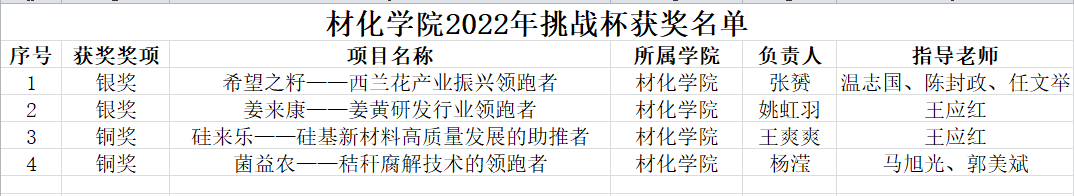 材化学院将继续做好学生创新创业工作,整合资源,形成合力,发展具有专业特色的大学生创新创业项目,积极引导青年学生践行“挑战杯”精神,勇攀高峰,追求创新梦想。