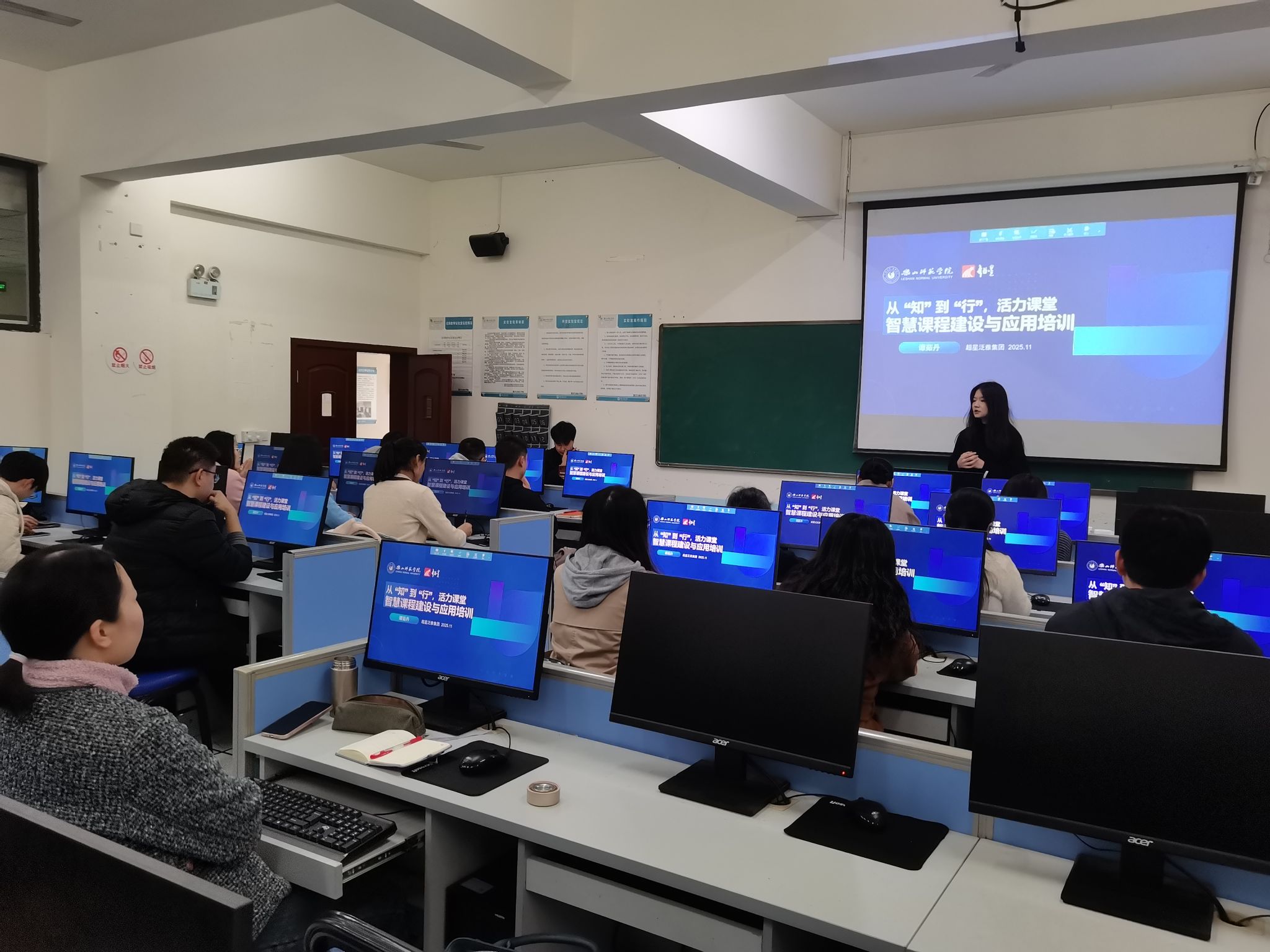 本网讯(文图/程苗)2025年11月6日下午,新能源材料与化学学院(简称“材化学院”)于实训楼B514开展“AI赋能智慧课程建设与应用”专题培训。本次培训特别邀请超星公司谭茹丹、谢世东两位老师讲授,材化学院专任教师参加本次培训。